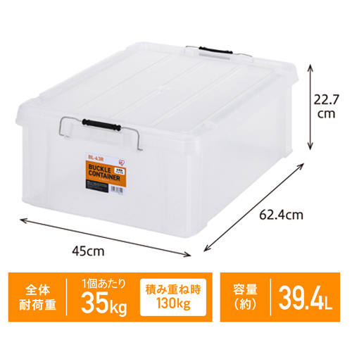 ●メーカー…アイリスオーヤマ(IRIS OHYAMA) ●型番…BL-43R ●サイズ(mm)…内寸:525×375×205(H) 外寸:624×450×227(H) ●重量…2500g ●材質…本体・ふた:ポリプロピレン バックル:ABS樹脂 線材:ステンレス ●カラー…クリアー ●容量…39.4L ●耐荷重…1個当たり35kg、積み重ね時130kg ●入数…1個 ●積み重ね可能 ●金属バックル仕様のフタ付コンテナです。 ●バックルの成形部分に凸面が付いているため指に引っかかりやすく、バックルをフタから取り外しやすくなっています。 ●金属バックルの端を樹脂でカバーしていますので、作業中の軍手や衣類の引っかかりを防止します。 ●重い荷物を入れて持ち運ぶ際にも手が痛くならないよう、持ち手部分に厚みをもたせました。 ●参考在庫数・商品詳細・サイズ情報はメーカー(参考)URLからもご確認いただけます。 ●最小出荷単位: 1