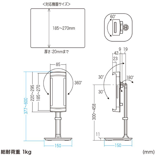 ●メーカー…サンワサプライ ●型番…PDA-STN83BK ●※注意※…【お客様組立品】 ●適応モニターサイズ…17.3インチまで(対応サイズ:幅185~270mm、厚さ16mmまで) ●耐荷重…1kg ●角度調節…対応 ●高さ調整…対応 ●サイズ…ホルダー垂直時 150(W)×150(D)×377~600(H)mm ●重量…約1.1kg ●材質…スタンド・伸縮アーム部:アルミ、スチール ホルダー部:ABS樹脂、シリコーンゴム ●付属品…六角レンチ(スタンドの底面に収納)、取扱説明書 ●伸縮アームによりモバイルモニターまたはタブレットの高さを調節可能なアームスタンド(17.3インチまで対応) ●目線の位置やノートパソコンの画面上の位置にセットできます。 ●角度調節に対応し、設置機器を垂直にセットして使用可能。 ●ホルダー部は360度回転できるボールジョイント構造。縦向きでも横向きでも使用可能。 ●アーム部分には、接続した充電ケーブルを固定することができるケーブルホルダー付き。 ●スタンド部分には、充電ケーブルを通せるケーブルホール付き。充電ケーブルをスタンド背面へすっきり配線。 ●ホルダーと底面には、キズ防止ゴムパッド付き。 ●組み立てや調整に使う六角レンチを使用し、調整ができます。※未使用時には底面へ収納し、紛失を防止できます。 ●参考在庫数・商品詳細・サイズ情報はメーカー(参考)URLからもご確認いただけます。 ●最小出荷単位: 1