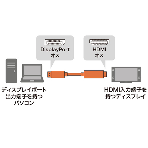 DisplayPortのパソコンとHDMIのディスプレイを、アダプタなしで直接接続することができる変換ケーブル