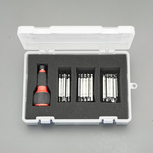 ●メーカー…ESCOオリジナル ●セット内容…・ラチェットドライバーハンドル ・(-)ビット×3本 ・(+)ビット×1本 ・(+)(-)ビット×1本 ・Hexビット×7本 ・ヘクスローブビット×9本 ●セット点数…22 ●ラチェットハンドル…95mm ●(-)ビット…(-)3×4mm・(-)4.5×5.5mm・(-)6×6.5mm ●(+)ビット…(+)#1×#3 ●(+)(-)ビット…(+)#2×(-)6mm ●Hexビット…1.5・2・2.5・3・4・5・6mm ●ヘクスローブビット…T7・T8・T9・T10・T15・T20・T25・T27・T30 ●差込六角対辺…1/4’’ ●ビット全長…65mm ●【パワーグリップドライバーハンドル(ラチェット式)特長】 ・ビット差し込み時、ハンドル内部の六角面としっかり面接触するので、ビットとハンドル部のがたつきがありません。 ・手の平に収まり力の掛けやすい大きなパワーグリップ形状で確かなトルク伝達を実現! ・山数60のギヤを内蔵!6°の送り角がスムーズな作業効率を実現! ・ハンドル後端部に「締める・緩める」がわかりやすく表記されており、切り替え確認が容易 ・ギア部は高強度、高性能の為本締めが可能です。 ●樹脂ケース付き ●※付属の工具袋は、予告なくデザイン変更になる場合があります。ご了承ください。 ●参考在庫数・商品詳細・サイズ情報はメーカー(参考)URLからもご確認いただけます。 ●最小出荷単位: 1