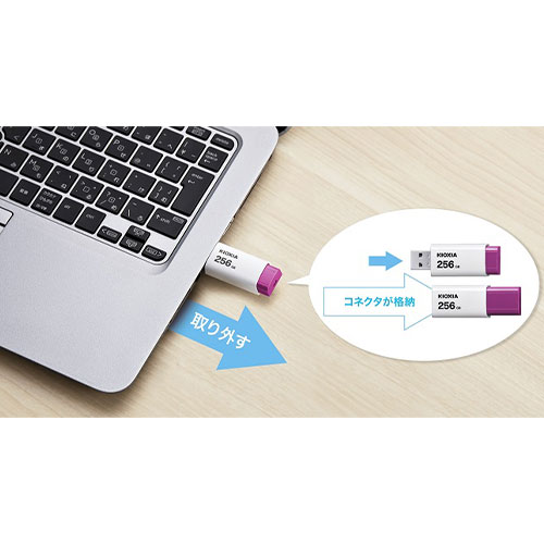 ●メーカー…キオクシア(KIOXIA) ●型番…KUN-3A256GK ●商品名…TransMemory U304 USBフラッシュメモリ ●容量…256GB ●対応OS…Windows 11 macOS Monterey 12, macOS Ventura 13, macOS Sonoma 14, macOS Sequoia 15 USBインターフェース(Type-A)を標準搭載し、以下のOSを搭載したモデル ●インターフェイス…USB 3.2 Gen 1 SuperSpeed 対応 / USB 2.0 high-speed ●コネクタ…USB Type-A ●電源…USBバスパワー ●サイズ…55.5(W)×20.5(D)×10.4(H)mm(コネクタ格納状態) ●重量…約9g ●カラー…ブラック ●動作温度…0~50度(結露しないこと) ●ワンプッシュで簡単にコネクタを出し入れすることができるノックスライド式 ●カバンやキーホルダーに簡単に取付ができる便利なストラップホール付き ●取り外しの際に自動でコネクタが格納されるオートリターン機構を搭載、コネクタの損傷を防ぎます ●PCおよびMacでのファイル転送におすすめ ●参考在庫数・商品詳細・サイズ情報はメーカー(参考)URLからもご確認いただけます。 ●最小出荷単位: 1