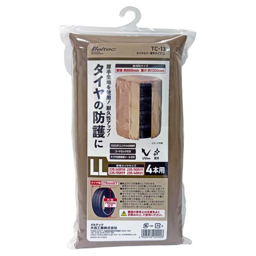 ●メーカー…大自工業(Meltec) ●型番…TC-13 ●適用車…RV車 ●タイヤ数…4本用 ●タイヤ幅…275mm以下 ●タイヤ外径…790mm以下 ●使用時サイズ…φ800×1200(H)mm ●参考タイヤサイズ…235/60R18、235/55R19、235/50R19、235/45R21 ●重量…約560g ●材質…300デニールポリエステル ●カラー…ライトブラウン ●付属品…タイヤ位置確認シール ●タイヤの防護に ●厚手生地を使用!耐久性アップ! ●UVカット、水や埃よごれに強い ●300デニールポリエステル生地を採用 ●強風でカバーが飛ばされないようしっかり固定するコードロック付き ●参考在庫数・商品詳細・サイズ情報はメーカー(参考)URLからもご確認いただけます。 ●最小出荷単位: 1