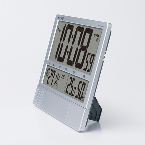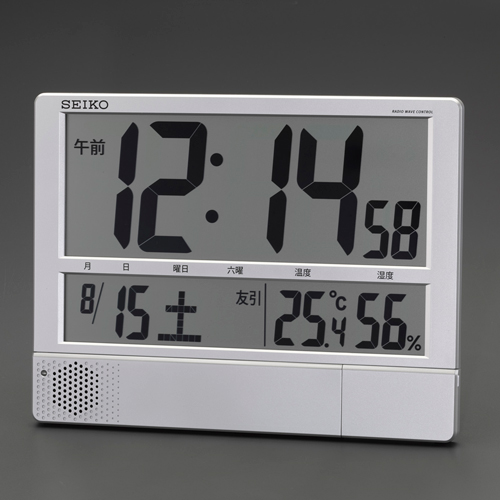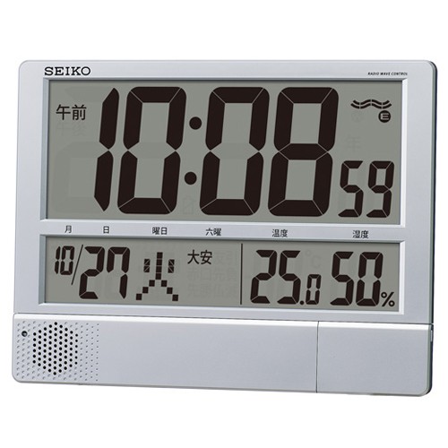 ●メーカー…セイコー(SEIKO)●型番…SQ434S●サイズ…掛けた状態:386(W)×31(D)×294(H)mm置いた状態:386(W)×112(D)×283(H)mm●周波数…40kHz/60kHz自動選局●電源…単3アルカリ電池×6本(付属)※モニター用電池として、マンガン電池を同梱しています。●電池寿命…約1年●温度…測定範囲:0~40℃測定精度:±2℃●湿度…測定範囲:25~85%RH、測定精度:±8%(25℃)●重量…1.3kg●フレーム材質…プラスチック枠(銀色メタリック塗装)●風防材質…ガラス●デジタル文字高…最大115mm●注意…付属電池はテスト電池ですので新しい電池をご購入下さい。●掛置兼用●電波受信機能●電波受信OFF機能●電池切れ予告機能(液晶)…電池切れが近づくとお知らせします●光センサーによる自動鳴止め(毎正時モードのみ)…光センサーにより一定以下の暗さになると音や動きを自動的に止めます●音量調節…メロディやアラームの音量を無段階で調節できます●報時モニター機能…正時メロディやチャイムを正時以外にも聞くことができます●2099年までのフルオートカレンダー機能…うるう年でも修正がいらないカレンダーです●温度・湿度表示…お部屋のコンディション管理に便利です●メロディ再生…32チャンネルプログラムまたは正時報時を選択可能●正時/プログラム/オフ切替式●高コントラスト液晶●12時間制/24時間制切替式●六曜表示●デジタル文字高115mmの大型ディスプレイと下からでも見やすい広い視野角●石膏ボード用掛金具付●参考在庫数・商品詳細・サイズ情報はメーカー(参考)URLからもご確認いただけます。 ●最小出荷単位: 1