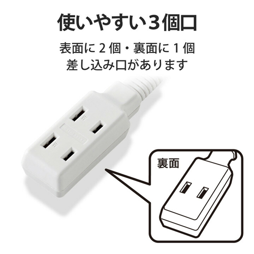 ●メーカー…エレコム●型番…T-M303WH●コード長…300mm●定格…125V・15A(1500W)●コンセント…2P×3個●プラグ形状…2P●材質…本体(差込口一体型):ユリア樹脂、プラグ:PVC●サイズ…29(W)×70(D)×21(H)mm(※コード・プラグ部分除く)●重量…約58g●PSE適合商品●【※注意※】…本製品は日本国内の電源を想定して設計されていますので、日本国外ではご使用いただけません。●持ち運びに便利な超小型3個口タップ。かばんに入れてもかさばらず、出張など外出に最適です。●コードをまとめるのに便利なケーブルタイ付●耐熱性に優れたユリア樹脂を使用しているので、万一の発熱の際にも融解しにくく、電気火災の防止に有効です。●二重被ふくコード採用で、断線や被ふく破れによる感電・火災の防止に有効です。●参考在庫数・商品詳細・サイズ情報はメーカー(参考)URLからもご確認いただけます。 ●最小出荷単位: 1