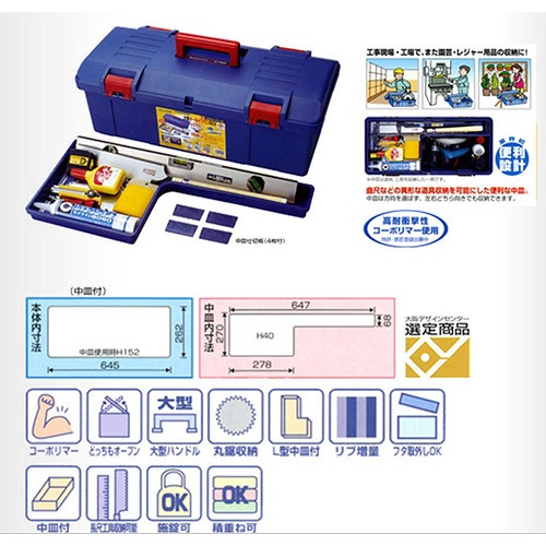 ●材質…高耐衝撃性コーポリマー●外寸…697×330×250(H)mm●内寸…645×262×152(H)mm(中皿使用時)●中皿高さ…40mm●重量…3.4kg●カラー…ブルー●南京錠取付穴(W×D)…19×7mm(2箇所)●付属品…L型中皿、中皿用仕切板(4枚)●フロント・バックどちらからでも開閉可能●中皿の仕切板は取外し可能●参考在庫数・商品詳細・サイズ情報はメーカー(参考)URLからもご確認いただけます。 ●最小出荷単位: 1