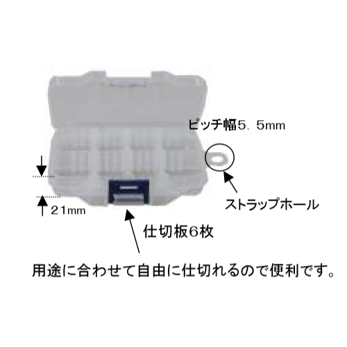 ●材質…耐衝撃性コーポリマー●サイズ…100×72×21(H)mm●仕切板は5.5mmピッチで調整できます。●仕切板…6枚●固定仕切板…1枚(横)●参考在庫数・商品詳細・サイズ情報はメーカー(参考)URLからもご確認いただけます。 ●最小出荷単位: 1