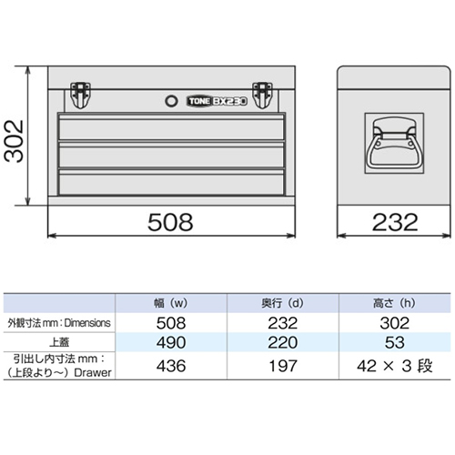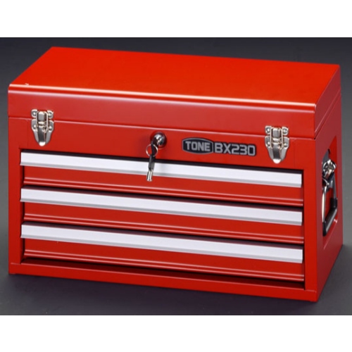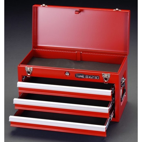 ●メーカー…TONE●型番…BX230●本体サイズ…508(W)×232(D)×302(H)mm●引出内寸…435(W)×195(D)×40(H)mm×3段●重量…9.2kg●引き出しはローラーベアリング式ダブルレール採用。開閉がスムーズで重量物の収納に最適●上蓋を閉じると引出しが自動ロック、飛出し防止ロック機能付●鍵2本付、マット4枚付●耐荷重…棚:30kg、引出し(一段):25kg●参考在庫数・商品詳細・サイズ情報はメーカー(参考)URLからもご確認いただけます。 ●最小出荷単位: 1