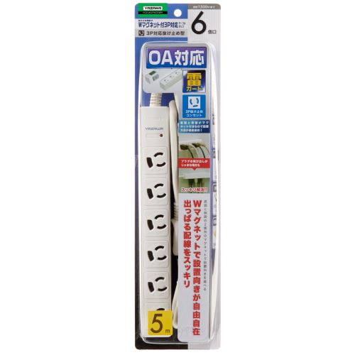 ●メーカー…ヤザワコーポレーション●型番…Y02JKNP605WH●コンセント…接地2P(抜止)×6口●コード長…5m●定格…15A・125V (1,500W)●雷サージ機能(本体内蔵)…最大サージ電圧:6,000V、制限電圧:650V●サイズ…35(W)×35(D)×260(H)mm●重量…905g●差込口は2Pでも3Pでも接続可能です。●2面にマグネットが付いているので好みの向きで固定でき、配線が飛び出ずスッキリさせることができます。●絶縁カバー付プラグはホコリや湿気によって発生するトラッキング火災を予防します(耐トラッキング仕様)。●雷サージフィルターが雷などの過電圧から接続機器を保護します。●差込口はロック機能付きで不意のプラグ抜けを防止します。●180°動くスイングプラグで狭い場所にも配線が可能です。●参考在庫数・商品詳細・サイズ情報はメーカー(参考)URLからもご確認いただけます。 ●最小出荷単位: 1