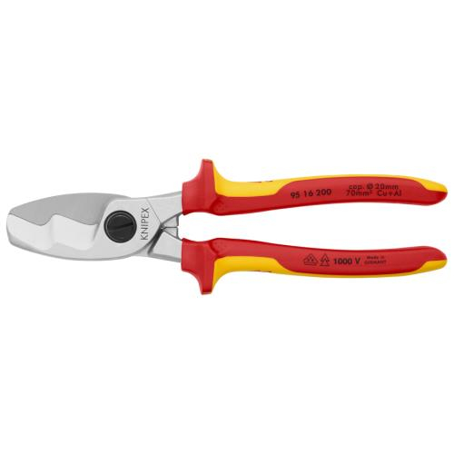 ●メーカー…KNIPEX(クニペックス)●型番…9516200●全長…200mm●切断能力…φ20mm(70mm2)●ハンドル…コンフォート(1000V絶縁)●仕上げ…クロムメッキ●刃長…42mm●ヘッド幅…31mm●重量…240g●銅・アルミケーブル用(スチールワイヤーの切断はできません)●先端の刃で予備切断し、根元の刃で追加の切断ができます。●参考在庫数・商品詳細・サイズ情報はメーカー(参考)URLからもご確認いただけます。 ●最小出荷単位: 1