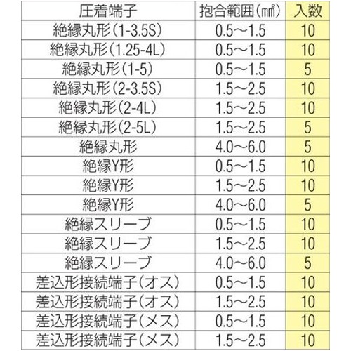 ●<セット内容>…絶縁丸形(1-3.5S): 0.5~1.5×10絶縁丸形(1.25-4L): 0.5~1.5×10絶縁丸形(1-5): 0.5~1.5×5絶縁丸形(2-3.5S): 1.5~2.5×10絶縁丸形(2-4L): 1.5~2.5×10絶縁丸形(2-5L): 1.5~2.5×5絶縁丸形: 4.0~6.0×5絶縁Y形: 0.5~1.5×10 1.5~2.5×10 4.0~6.0×5絶縁スリーブ: 0.5~1.5×10 1.5~2.5×10 4.0~6.0×5差込形接続端子(オス): 0.5~1.5×10 1.5~2.5×10差込形接続端子(メス): 0.5~1.5×10 1.5~2.5×10●結束バンド 2.5×100mm(白)×25 2.5×140mm(青)×15 2.5×140mm(緑)×15●圧着ペンチ…228mm●ケースサイズ…235×106×40(H)mm●総重量…488g●参考在庫数・商品詳細・サイズ情報はメーカー(参考)URLからもご確認いただけます。 ●最小出荷単位: 1