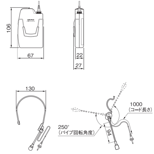 ●メーカー…ユニペックス(UNI-PEX)●型番…WM-3130●300MHz帯●単一指向性エレクトレットコンデンサー型●サイズ…66(W)×22(D)×106(H)mm●重量…140g(電池含む)●電源…単3電池×1本(付属)●コード長…約1m●送信周波数…322.025MHz~322.150MHz、 322.250MHz~322.400MHz (25kHz間隔、13波)中1波●アンテナ…内蔵アンテナ●消費電流…45mA(1.5Vにて)●付属品…チャンネル設定ドライバー×1、単3電池×1本、ヘッドセット形マイク×1、ウインドスクリーン×2(うち1個は本体取付済)、チャンネル表示ラベル×1●耳掛け式のヘッドセットマイクを採用し、髪型を崩すことなく使用できます。●髪型が崩れにくく、激しい動きでもズレにくいので、女性の方や、動きの激しいダンス等での使用にも最適です。●バランスのとれた明瞭な音質の単一指向エレクトレットコンデンサー型●チューナーとマイクのチャンネルを合わせるだけで、13チャンネル対応。●ボディは軽量・コンパクト設計で、体にフィットするデザインです。●※付属電池はテスト電池ですので新しい電池をご購入下さい。●参考在庫数・商品詳細・サイズ情報はメーカー(参考)URLからもご確認いただけます。 ●最小出荷単位: 1