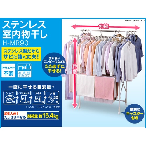 ●メーカー…アイリスオーヤマ(IRIS OHYAMA)●型番…H-MR90●※注意※…【お客様組立品】●材質…パイプ:ステンレス巻きスチール、部品:ABS樹脂、ポリプロピレン●収納サイズ…890(W)×160(D)×1000(H)mm●重量…4.9kg●干せる目安…シャツ25枚、バスタオル6枚、タオル6枚、小物20枚●使用サイズ…890~1400(W)×720(D)×1000~1650(H)mm●耐荷重…15.4kg●キャスター付●参考在庫数・商品詳細・サイズ情報はメーカー(参考)URLからもご確認いただけます。 ●最小出荷単位: 1