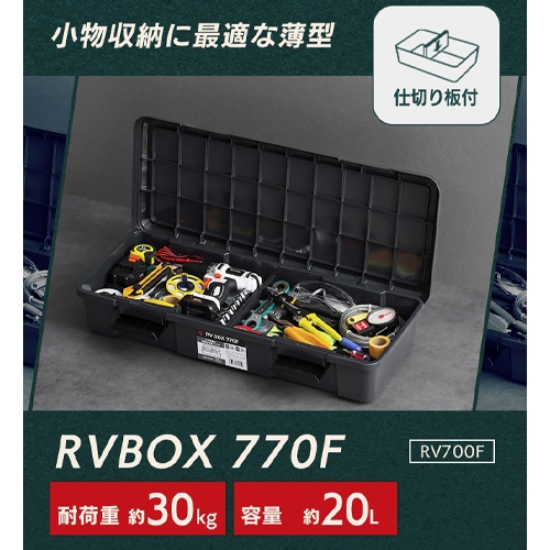 ●メーカー…アイリスオーヤマ(IRIS OHYAMA)●型番…770F●サイズ(mm)…外寸:770×320×155(H)内寸:710×235×132(H)●重量…2.0kg●耐荷重…約30kg(フタ)●容量…約20L●材質…ポリプロピレン●カラー…本体:ダークグリーン、蓋:グレー●仕切板1枚付●鍵穴なし●スタッキング可能な浅型タイプのRVボックスです車のラゲッジスペースでサブトランクとして使用するのに最適です。●小物収納にも最適な薄型タイプで、仕切り板付きだからしっかり整理できる。●さまざまなシーンで大活躍する、多目的収納ボックスです。・ガーデニング用品:ホースや肥料、スコップなど。小物が多いガーデニング用品もすっきり収納。・アウトドア:寝袋にランタン、調理器具など。キャンプやBBQ用品をまとめて収納&持ち運べて、車に積める。・お子様のおもちゃ入れ:ぬいぐるみ等のかさばるおもちゃもまとめて収納!「お片付け」の練習に。・防災グッズ:いざという時に必要な水、ヘルメット、軍手、毛布等防災用品を入れておけば持ち出しにも便利。・食料品のストッカー:まとめ買いしたストック用の食品や飲料の保管に。ほこりや油汚れを防いですっきり清潔収納!●補強リブ入りで頑丈なフタは、ちょっと物を置きたい時にも便利。●プラスチック製で水で丸洗いOKだから、汚れても大丈夫!●※車載する場合は、お車のトランクのサイズを確認の上、お買い求めください。※ふたには耐荷重以上の荷重をかけないでください。※火のそばで使用したり、直射日光のもとで長時間放置しないでください。●参考在庫数・商品詳細・サイズ情報はメーカー(参考)URLからもご確認いただけます。 ●最小出荷単位: 1