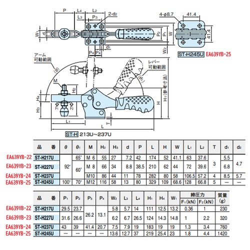 ●メーカー…イマオコーポレーション●型番…ST-H227U●水平レバー・下方押え型●クランプ部…クロロプレンゴム●材質…SPCC(亜鉛メッキ)●RoHS対応品●締付能力…225kg●取付金具サイズ…44×39.6mm●全長…190mm●参考在庫数・商品詳細・サイズ情報はメーカー(参考)URLからもご確認いただけます。 ●最小出荷単位: 1