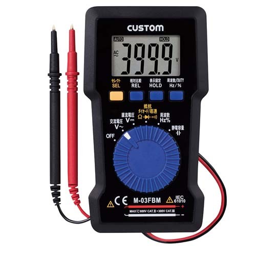 ●メーカー…カスタム(CUSTOM)●型番…M-03FBM●直流電圧…●レンジ 4V/40V/400V/600V●分解能 0.001V/0.01V/0.1V/1V●確度 ±(1.0%+3dgt)●入力インピーダンス 10MΩ●交流電圧…●レンジ 4V/40V/400V/600V●分解能 0.001V/0.01V/0.1V/1V●確度 ±(2.0%rdg+5dgt)●入力インピーダンス 10MΩ●抵抗…●レンジ 400Ω/4kΩ/40kΩ/400kΩ/4MΩ/40MΩ●分解能 0.1Ω/0.001kΩ/0.01kΩ/0.1kΩ/0.001MΩ/0.01MΩ●確度 ±(2.0%rdg+5dgt)●開放電圧 約0.4 V●周波数…●レンジ5Hz/50Hz/500Hz/5kHz/50kHz/100kHz●分解能 0.001Hz/0.01Hz/0.1Hz/0.001kHz/0.01kHz/0.1kHz●確度 ±(0.5%rdg+5dgt)●静電容量…●レンジ 50nF/500nF/5μF/50μF/100μF●分解能 0.01nF/0.1nF/0.001μF/0.01μF/0.1μF●確度 ±(5.0%rdg+5dgt)●検波方式…平均値方式●表示…最大3999カウント●レンジ切替…オートレンジ●極性表示…’’-’’のみ表示●サンプリング…約3回/秒●使用温湿度…0~+40℃、80%RH以下(但し、結露のないこと)●保存温湿度…-10~+60℃、70%RH以下(但し、結露のないこと)●サイズ…70(W)×12.5(D)×127(H)mm●重量…約101g(電池含む)●電源…CR2032×1個(付属)●電池寿命…約120時間●テストリード長…約700mm●適合規格…IEC61010-1 準拠 CAT? 600V、CAT? 300V●校正…可●測定機能…●直流/交流電圧●抵抗●ダイオードチェック●導通チェック(LED & ブザー音通知)●周波数●DUTY●コンデンサチェック●オートパワーオフ機能…約30分(解除可能)●付属品…●取扱説明書(保証書付)●ソフトケース●CR2032コイン電池×1個(テスト用)●用途…工業現場や電気工作での電圧等のチェック、学校での技術実習等のチェックに●本体背面に磁石を内蔵。金属面に取り付け可能。●コンパクトなボディーに電圧(直流、交流)、抵抗、周波数、静電容量、導通チェック機能(ブザー、LED)、ダイオードチェック機能を持たせた、小型軽量のデジタルマルチメータ●テストリードを本体周囲に巻き付けて収納可能●金メッキテストリード採用、先端19mm●テストリードは金メッキ処理されており接触不良が起きにくくなっています。●参考在庫数・商品詳細・サイズ情報はメーカー(参考)URLからもご確認いただけます。 ●最小出荷単位: 1