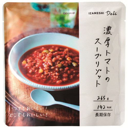 【野菜だけでつくったヘルシーなトマトリゾット】もしもの時に心強い、おいしい長期保存食です。封を切って常温のまま食べられます。地震などの災害時の備えに「IZAMESHI Deli」は大活躍。厳しい品質管理と多くの工夫によって、保存料を使用せずに長期保存を実現した「IZAMESHIDeli」で、いつ起こるかわからない災害にもしっかり備えましょう。化学調味料不使用で、だしや調味料で味を整えているため、食卓のおかずにもおすすめです。