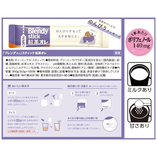 ●種別:紅茶オレ●入数:100本●内容量(個装):9.0g●何杯分:100杯分●タイプ:スティックタイプ●ミルク:有●シュガー:有●甘さ:有●ブランド:AGF ブレンディ●軽減税率:対象●製造国:日本●メーカーの都合によりパッケージや仕様などが変更になる場合がございますので、あらかじめご了承ください。 ●最小出荷単位: 1