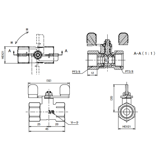 G3/8xRc3/8ボールバルブ 真鍮製/蝶ハンドル