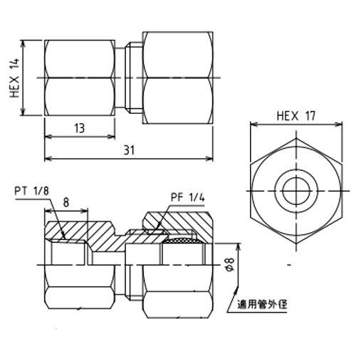 ●メーカー…アソー(ASOH)●型番…RF-1108●取付ねじ…Rc1/8’’●適用管外径…8mm●本体六角対辺…14mm●ナット六角対辺…17mm●全長…31mm●使用圧力…3.45MPa以下●使用温度…-50~150℃●使用流体…空気・水・油●材質…真鍮●入数…1個●内ネジ・リングジョイント●銅管と機器、または装置を接続するためのリング式の取付側のネジが内ネジタイプのジョイントです。●専用工具を使わずに接続が可能です。専用工具を使わずに接続が可能です。●リング玉1個付属●参考在庫数・商品詳細・サイズ情報はメーカー(参考)URLからもご確認いただけます。 ●最小出荷単位: 1