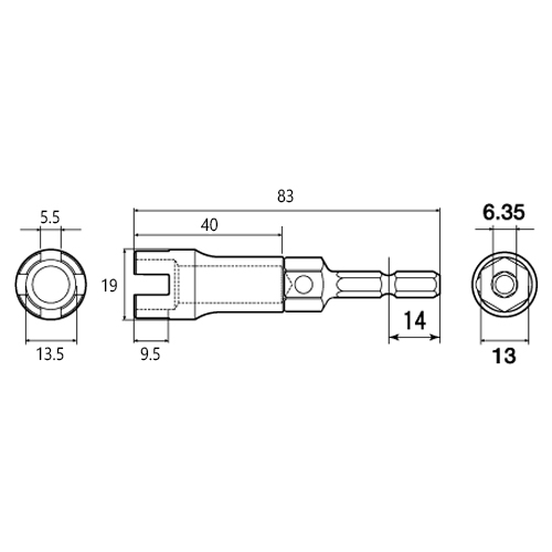 ●メーカー…トップ工業(TOP)●型番…ECS-M6●用途…蝶ねじ、蝶ねじボルトの着脱に●適応ネジ径…M6●外径…19mm●六角軸…6.35mm●全長…83mm●重量…55g●最大トルク…47N・m●材質…SCM435●電動・手動兼用タイプ●手では廻し難い蝶ネジを、電動工具等で簡単に廻す事ができます。●13mmのメガネ類や板ラチェット類などに装着して、手動用としても使用できます。●13mm六角部は、脱落防止用ボール付き●ビニールハウス・パイプ車庫の組立・解体、野生動物侵入用電気柵の設置(ガイシの取付け)に●<注意>・蝶ネジに合った寸法のソケットを使用して下さい。・保証トルク(47N・m)以内で正しく安全にご使用下さい。・レンチ等に装着しての高所作業は行わないでください。落下する恐れがあります。・過大な荷重を掛けますと六角シャンク部が破損する恐れがあります。・電動ドリルはクラッチ付き、又は、インパクト付きをご使用下さい。・工具の使用目的以外には使用しないで下さい。●参考在庫数・商品詳細・サイズ情報はメーカー(参考)URLからもご確認いただけます。 ●最小出荷単位: 1