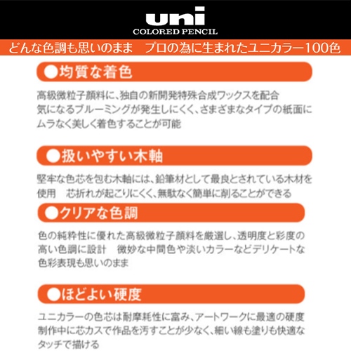 ●メーカー…三菱鉛筆(uni)●型番…UC100CN2●商品名…ユニカラー●色…100色セット●ケースサイズ…縦238×横382×厚さ71mm●総重量…2000g●100色セット●クリアな色調、均質な着色、ほどよい硬度を持つ、アートワークに最適なプロ仕様色鉛筆です。●クリアな色調色の純粋性に優れた高級微粒子顔料を厳選し、透明度と彩度の高い色調に設計しています。●微妙な中間色や淡いカラーもくっきりとクリアなユニカラーなら、デリケートな色彩表現が思いのままです。●均質な着色高級微粒子顔料に三菱鉛筆独自の新開発特殊合成ワックスを配合。気になるブルーミングが発生しにくいだけでなく、さまざまなタイプの紙面にムラなくなじみ、美しく着色します。●扱いやすい木軸芯折れがしにくく無駄なく削れます。●ほどよい硬度ユニカラーの色芯は耐磨耗性に富み、しかもアートワークに最適の硬度です。製作中に芯カスで作品を汚すことが少なく、細い線も塗りも快適なタッチで描けます。●参考在庫数・商品詳細・サイズ情報はメーカー(参考)URLからもご確認いただけます。 ●最小出荷単位: 1