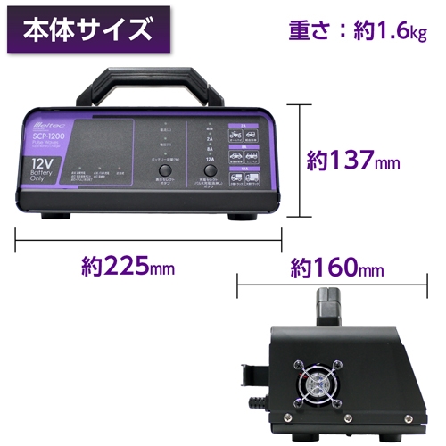 ●メーカー…大自工業(Meltec)●型番…SCP-1200●用途…オートバイ・自動車(軽/普通)・ミニバン・トラック(小型/大型)のDC12Vバッテリーを充電できます。●入力電圧…AC100V(50/60Hz)●消費電力…215W●出力電圧…DC12V●出力容量…12A(最大電流)●適合バッテリー電圧…DC12V:鉛バッテリー(開放型/密閉型)・AGM(ドライセルバッテリー)●適合バッテリー容量…6Ah~140Ah(5時間率容量)●表示…ランプ表示(充電中・充電完了・パルス充電・診断中・逆接続)、デジタル表示●保護機能…逆接続・バッテリー不良・電圧確認・過電流・高温・タイムオーバー●充電方式…定電流定電圧/オート充電●コード長…電源コード:約1.8m充電コード:約1.8m●使用環境温度…0~40℃●サイズ…225×160×137(H)mm●重量…約1.6kg●サルフェーションを除去する事でバッテリーの充電能力を回復し、バッテリー寿命を延ばすパルス充電機能。●バッテリーの容量や状態に合わせて充電を制御する自動充電機能。※バッテリー容量を任意で選択する充電も可能です。●充電完了後に接続したままでもバッテリーの自然放電を補うためにパルス充電を行いバッテリー寿命を延ばすトリクル充電機能。●充電器がバッテリー診断を行い充電可・不可を判断した後に充電方法を自動選択します。●バッテリーにクリップを繋いだ時に火花が出ません。●バッテリーを載せたまま充電できます。●本体背面部の収納フックに電源コードと充電コードをまとめて巻いて収納することができます。●参考在庫数・商品詳細・サイズ情報はメーカー(参考)URLからもご確認いただけます。 ●最小出荷単位: 1