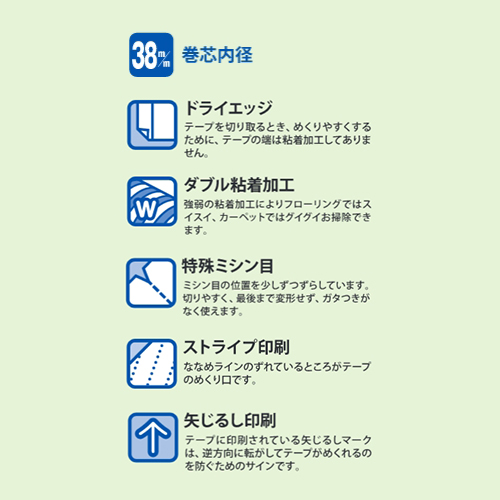 ●メーカー…ニトムズ●型番…C2470●商品名…コロコロフロアクリン●用途…フローリング・カーペット・たたみ兼用●粘着タイプ…特殊すじ塗り粘着●テープサイズ…160(W)mm×30周巻●全長(mm)…610~970●芯内径…38mm●材質…テープ:特殊すじ塗り粘着加工紙シャフト:アルミ(クロムメッキ)グリップ、ケース:ポリプロピレン、エラストマー●テープを切り取るとき、めくりやすくするために、テープの端は粘着加工してありません。●ダブル粘着加工のため、強弱の粘着加工によりフローリングではスイスイ、カーペットではグイグイお掃除できます。●ミシン目の位置を少しずつずらしています。切りやすく、最後まで変形せず、ガタつきがなく使えます。●ななめラインのずれているところがテープのめくり口です。●テープに印刷されている矢印マークは、逆方向に転がしてテープがめくれるのを防ぐためのサインです。●参考在庫数・商品詳細・サイズ情報はメーカー(参考)URLからもご確認いただけます。 ●最小出荷単位: 1