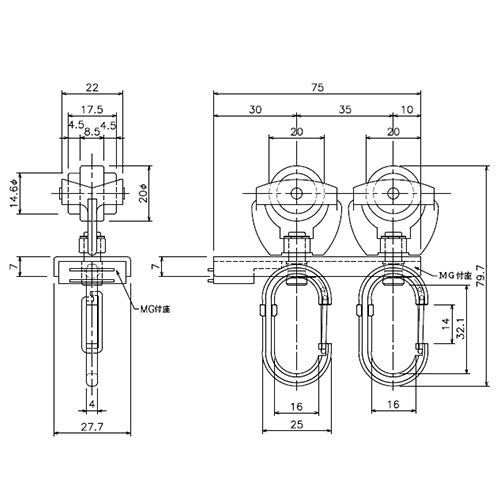 マグネットランナーフック付40mmレール片開