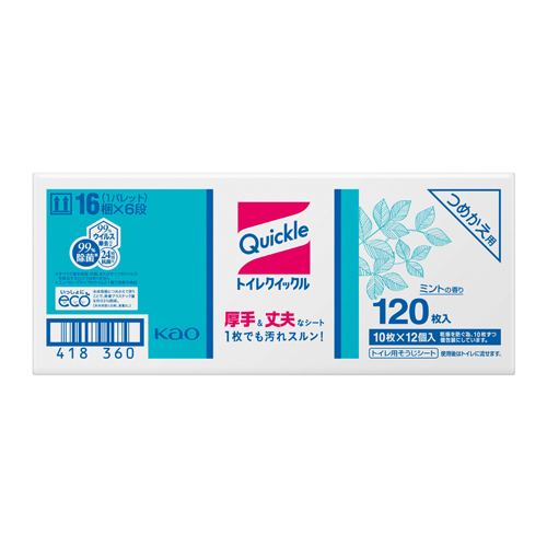 ●メーカー…花王●商品名…トイレクイックル つめかえ用●仕様…詰替シート(120枚)10枚×12パック●シートサイズ…約300×245mm●液性…弱酸性●成分…・界面活性剤(アルキルグリコシド)・グリコールエーテル・安定化剤・除菌剤●ミントの香り●除菌・消臭成分配合●厚手で丈夫なデコボコシート。●トイレットペーパーと同じ溶けやすさで安心してトイレに流せます。●参考在庫数・商品詳細・サイズ情報はメーカー(参考)URLからもご確認いただけます。 ●最小出荷単位: 1