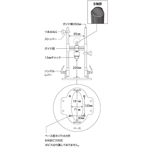 ●メーカー…神沢鉄工●型番…K-802-4●最大ストローク…200mm●ベースサイズ…71×181mm(V溝付き)●全長…350mm●重量…2.5kg●材質…本体:アルミダイキャスト●穴あけ範囲…ベース穴径71:mm●シャンク…10mm 丸 三面取軸●チャック…13mmドリルチャック●注意事項…使用前にチャック部、及び、各ネジ部は確実に締め付けてください。電気ドリル以外の取付はしないでください。作業中は飛散物から目を守る為、必ず防塵メガネを着用してください。使用中に異常を感じたら、直ちに停止して点検を行ってください。●13mmキーレスチャック付(6.35mm六角軸)●30°~90°の傾斜角度調整が可能です。●本体は軽量で丈夫なアルミダイキャスト製●垂直の正確な穴をあけることができます●ベース部分にケガキ線が入ったので、センター出しが簡単になりました。●V型ブロックは取り外し可能。取り付ければパイプや丸棒の、取り外せば角材等の中心に穴をあけられます。●穴の深さは、ストッパーの位置を調整して自由に決められます●つまみねじは締めやすい大口径のものを採用●参考在庫数・商品詳細・サイズ情報はメーカー(参考)URLからもご確認いただけます。 ●最小出荷単位: 1