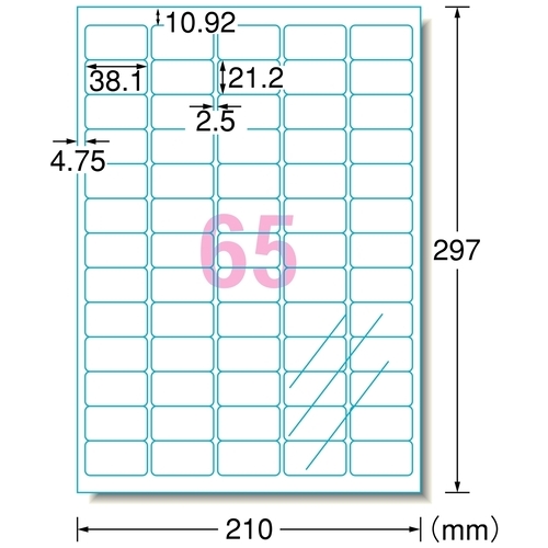 ●面数:65面●1冊入数:10シート●片数:650●総厚[μm]:150●ラベル厚:70μm●色:光沢透明●1シート寸法(横)[mm]:210●1シート寸法(縦)[mm]:297●1片寸法(横)[mm]:38.1●1片寸法(縦)[mm]:21.2●規格:A4/65面●材質:ポリエステルフィルム+レーザー専用塗工●ラベルシール・レーザープリンタ(透明フィルムタイプ)<A4>●製造国:日本●シールタイプ ●最小出荷単位: 1