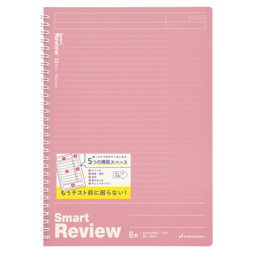 ●外形寸法(横)[mm]:187●外形寸法(縦)[mm]:257●行数[行]:34行●罫内容:B罫6mm 復習罫●枚数:40枚●綴じ仕様:スパイラル綴じ●表紙色:ピンク●規格:B5●製造国:日本 ●最小出荷単位: 1