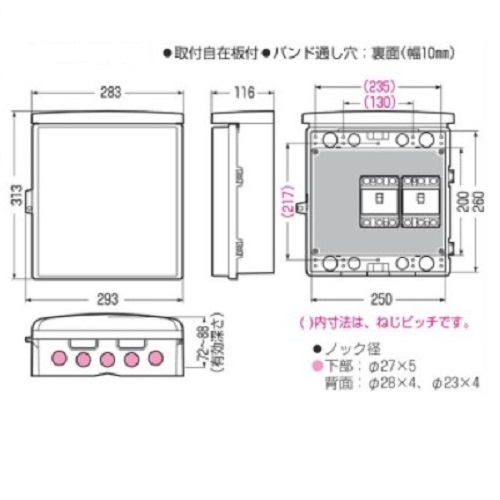 ●メーカー…未来工業●型番…WB-12DM●取付スペース…ELB:3P・60AF×2●ボックス外形寸法…313×293×116mm●重量…1380g●バンド通し穴…裏面にあり(通し穴幅:10mm)●ノック径…下部:φ27mm×5背面:φ28mm×4、φ23mm×4●材質…ABS樹脂●カラー…ミルキーホワイト●ヨコ型●常設に適したスッキリデザイン●器具の取付位置自在。取り外し可能な樹脂製基台を採用●取付自在板は正面から脱着できます●本体と屋根は一体型です。●防雨型●参考在庫数・商品詳細・サイズ情報はメーカー(参考)URLからもご確認いただけます。 ●最小出荷単位: 1