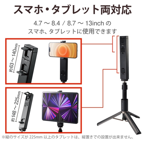 タブレット、スマートフォン両方で使える、三脚&自撮り棒です。13インチまでのタブレットを固定できる大型ホルダーが付属します。自撮り棒としても使用できる2Wayタイプのスマートフォン・タブレット用三脚です。※タブレットを装着する際は、三脚としてのみご使用ください。縦撮り、横撮りの両対応です。※撮影の際はネジをしっかりと締めてください。※雲台は垂直付近に調節してご使用ください。傾けすぎると、転倒の恐れがあります。※縦のサイズが225mm以上のタブレットについては、縦置きでの設置が出来ません。三脚として使用する際は380mmから470mmまで高さ調整ができます。脚の部分をひねるだけで簡単にロックでき、高さ調節ができます。タブレットとスマートフォン両方を固定できる大型ホルダーが付属します。三脚は123g、180mmとコンパクト。カバンなどに入れて簡単に持ち運びができます。※ホルダーを取り付けたときのサイズは約355mmです。すっきりとした形状とマットな質感で高級感のあるデザインです。スマートフォンホルダーには落下防止のすべり止めがついており、落下のリスクを軽減します。耐荷重約は1.5kgです。※三脚状態なおかつ、雲台を垂直付近に固定した場合の耐荷重です。ホルダーは4.7~8.4 8.7~13インチまでのスマートフォン・タブレットに対応しています。
