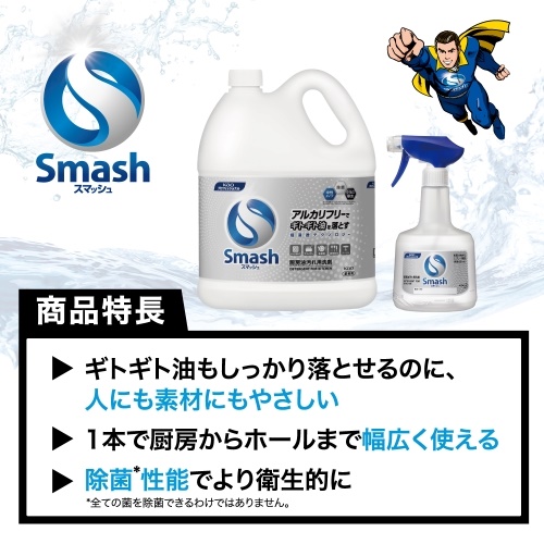 ●メーカー…花王プロフェショナル●商品名…スマッシュ 業務用●成分…界面活性剤(9%、アルキルアミンオキシド、アルキルグリコシド)●内容量…5L(業務用)●サイズ(W×D×H)mm…151×218×288●重量(kg)…5.2●用途…レンジ、オーブン、食器・調理器具、冷蔵庫、床などの清掃まで1本で幅広く使えます。●中性タイプでありながら、アルカリ洗剤並みの抜群の洗浄力●アルカリフリーでギトギト油を落とす、厨房油汚れ用洗剤です。●原液~300倍希釈で、フライヤー周りの汚れから、食器・調理器具、客席の清掃まで1本で幅広く使えます。●除菌、ウイルス除去●つぶせる容器●参考在庫数・商品詳細・サイズ情報はメーカー(参考)URLからもご確認いただけます。 ●最小出荷単位: 1
