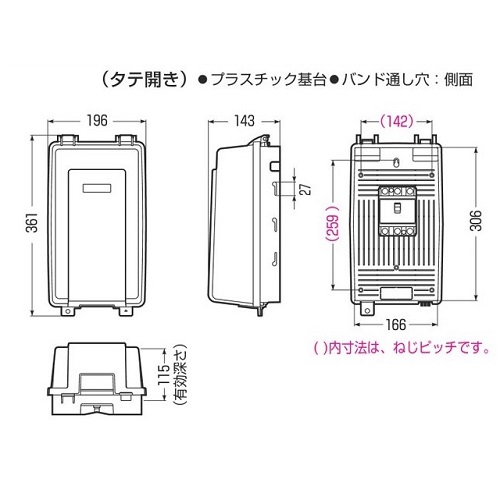 ●メーカー…未来工業●型番…WB-2LJ●取付スペース…ELB:3P・60AF×1●サイズ…196(W)×143(D)×361(H)mm●有効深さ…115mm●重量…770g●バンド通し穴…側面にあり(通し穴幅:27mm)●材質…ABS樹脂●カラー…ベージュ●タテ型●プラスチック製ですから軽量で、アース工事が不要です。●耐衝撃性、耐候性に優れた防雨構造●タテ開きは下面に開口部が設けてあり、フードを閉めたままコードが引き出せます。●プラスチック基台●扉は本体と分離できます。●参考在庫数・商品詳細・サイズ情報はメーカー(参考)URLからもご確認いただけます。 ●最小出荷単位: 1