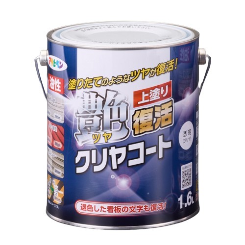 ●カラー…クリア●内容量…1.6L●乾燥時間…夏期:1.5~2時間冬期:2~3時間●塗り重ね時間の目安…夏期:6時間以上冬期:12時間以上●塗り面積(1回塗り)…21~24m2(タタミ13~15枚分)●塗膜の仕上がり…透明●用途…外壁、鉄扉、金属看板、各種サイディング、金属屋根、FRP・アクリル・硬質塩ビの塗装面●適さない場所…・直接食品に触れる箇所、絶えず水がかかったり水につかるところ、いつも湿っているところ、耐熱性が必要なところ・自動車・バイクの補修、床面、テーブルの天面、常に衣服が接するイス等、シルバー系の塗装面●適さない素材…かわら屋根、カラーベスト、ポリエチレン、ポリプロピレン、フッ素系塗装のサイディング●つや有り●水性・油性塗料に上塗り可能です。●透明仕上げのため、塗り継ぎの心配や、細かいマスキング(塗装文字、色分けされた塗装面へのマスキング等)の必要がありません。●鉛・クロム化合物不使用●旧塗膜へ塗装する事で、塗りたてのような光沢が復活します。●特殊アクリル樹脂の採用で耐候性が良好です。●屋内外用●【注意事項】・表示の用途以外には使用しないでください。・素地に密着していない旧塗膜には適しません。塗装面の端でセロハンテープを用い、旧塗膜が素地に密着していることを確認してください。・旧塗膜を侵す恐れがありますので、目立たない部分で試し塗りをして乾燥性・旧塗膜への影響・密着性などをよく調べて、異常がないことを確かめてから塗ってください。・うすめずに塗ってください。・吸い込みの大きい面に塗ったときなど、ツヤが出にくい場合は重ね塗りします。その際、何度もハケ返しすると下地を溶かし、塗りにくくなりますので素早く塗ってください。●参考在庫数・商品詳細・サイズ情報はメーカー(参考)URLからもご確認いただけます。 ●最小出荷単位: 1