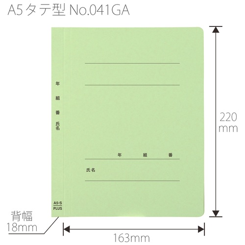 ●外形寸法(縦)[mm]:220●外形寸法(横)[mm]:163●色:グリーン●背幅[mm]:18●穴数[穴]:2●穴間隔[mm]:80●規格:A5-S●材質:表紙=ファイルカード紙(ノンステッチ加工)、とじ具=ポリプロピレン(3つ山ストッパー)●年・組・番・氏名の記入欄付 ●最小出荷単位: 1