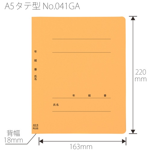 ●外形寸法(縦)[mm]:220●外形寸法(横)[mm]:163●色:イエロー●背幅[mm]:18●穴数[穴]:2●穴間隔[mm]:80●規格:A5-S●材質:表紙=ファイルカード紙(ノンステッチ加工)、とじ具=ポリプロピレン(3つ山ストッパー)●年・組・番・氏名の記入欄付 ●最小出荷単位: 1