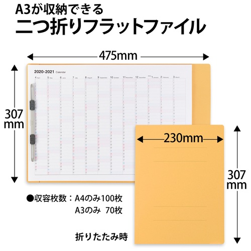 ●外形寸法(縦)[mm]:307●外形寸法(横)[mm]:230●色:イエロー●収容枚数[枚]:A4のみ=100枚、A3のみ=70●背幅[mm]:15●穴数[穴]:2●穴間隔[mm]:80●規格:A4-S●材質:表紙=ファイルカード紙、とじ具=ポリプロピレン/対応サイズ:A3判2つ折り●A4・A3両用 ●最小出荷単位: 1