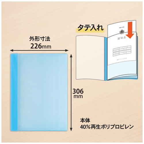 ●外形寸法(縦)[mm]:306●外形寸法(横)[mm]:226●色:ライトブルー●ポケット数:6枚●背幅[mm]:3●ポケット厚[mm]:0.04●表紙厚(表)[mm]:0.2●表紙厚(裏)[mm]:0.4●収容枚数[枚]:12●規格:A4-S●材質:ポリプロピレン●タテ入れ●中紙なし●透明表紙●成績表におすすめ ●最小出荷単位: 1