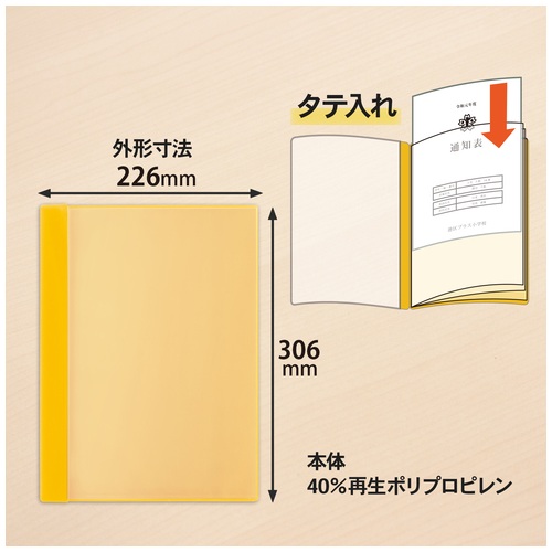 ●外形寸法(縦)[mm]:306●外形寸法(横)[mm]:226●色:イエロー●ポケット数:6枚●背幅[mm]:3●ポケット厚[mm]:0.04●表紙厚(表)[mm]:0.2●表紙厚(裏)[mm]:0.4●収容枚数[枚]:12●規格:A4-S●材質:ポリプロピレン●タテ入れ●中紙なし●透明表紙●成績表におすすめ ●最小出荷単位: 1