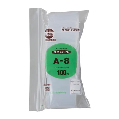 ●メーカー…生産日本社(セイニチ)●型番…A-8●商品名…ユニパック●チャック下サイズ(mm)…70×50●厚み(mm)…0.08●入数…100枚●材質…ポリエチレン●フィルム厚0.08mmで耐衝撃性に優れたチャック袋です。●PE単層、溶断シール●食品衛生法適合品●日本製●参考在庫数・商品詳細・サイズ情報はメーカー(参考)URLからもご確認いただけます。 ●最小出荷単位: 1