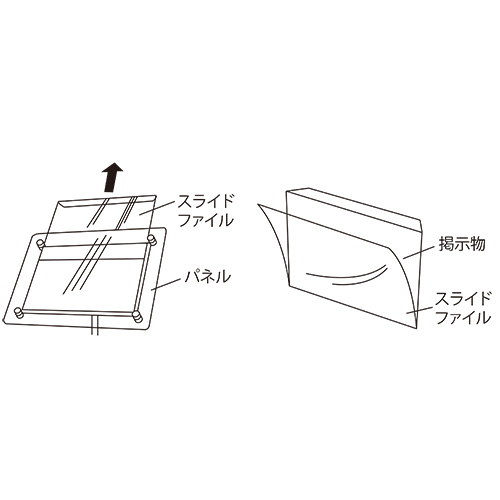 アクリル板を使用した、スッキリしたデザイン。スライドファイルにはさむだけ。掲示物の交換が簡単に行えます。板面の角度を直立・傾斜(30度)で調節できます。