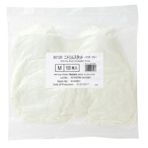 ●メーカー…ショーワグローブ●型番…B0120●サイズ…M●全長(mm)…290●掌周り(mm)…190●中指長さ(mm)…76●材質…樹脂部:合成ゴム(ニトリルゴム)●厚み…0.05mm●カラー…ホワイト●入数…100枚●用途…運輸・物流業、食品関連業、機械工業、精密機械工業、自動車関連業、石油・化学関連業など。●仕様…左右兼用/パウダーフリータイプ●食品衛生法適合品●全長290mmのロングタイプのため、手首の露出を防ぎます。●素手感覚が活かせる極薄手タイプです。●極薄手タイプのため、やわらかく手にフィットします。●粉なしでもぬぎはめしやすくするため、内面に加工を施しています。●帯電防止効果があるため、静電気対策にもお使いいただけます。●ニトリルゴム製のため、耐油性に優れています。●食品加工など食品に直接触れる作業でもお使いいただけます。●-使用上の注意-・アレルギー反応等により、体質によっては、かゆみ・かぶれ・発疹等をおこすことがあります。異常を感じたら使用を中止し、医師に相談してください。・高濃度の薬品や溶剤(ガソリン・ベンジン類)には、使用しないでください。膨潤、浸透することがあります。・熱いものに触れないでください。火傷するおそれがあります。・爪先・刃物や尖ったもの等で傷をつけないようご注意ください。水がしみこむ原因となります。・感電のおそれがあるため、電気作業には使用しないでください。・保管する時には直射日光を避けてください。・本品は使いきりのため、再使用しないで下さい。●参考在庫数・商品詳細・サイズ情報はメーカー(参考)URLからもご確認いただけます。 ●最小出荷単位: 1