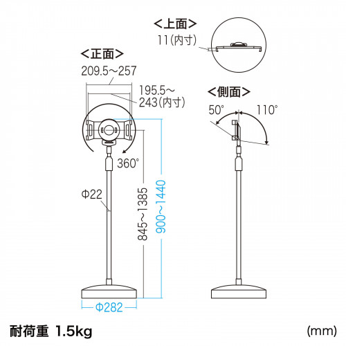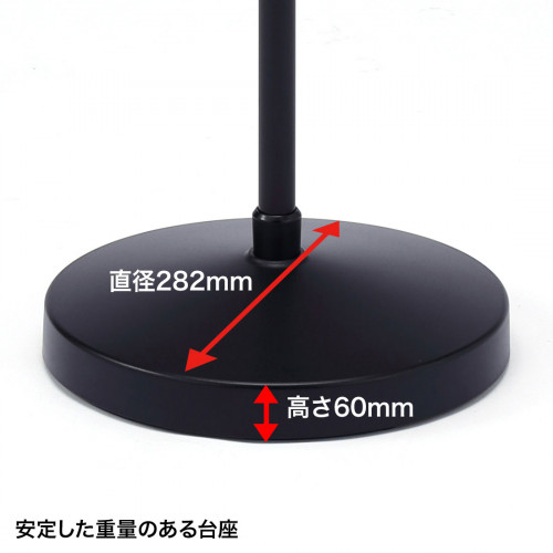 ●メーカー…サンワサプライ●型番…MR-TABST12N●※注意※…【お客様組立品】●ご注意…※機器にケースなどを取付けた場合はホルダーに挟み込みができない場合もあります。(挟み込み200~240mm、厚さ10mm以下対応)対応サイズと機器サイズをご確認ください。●カラー…ブラック●サイズ…直径282×H900~1440(支柱)mm●材質…本体/スチール(エポキシ樹脂粉体塗装)、ホルダー/PC(ポリカーボネート)●重量…約5.5kg●出荷形態…ノックダウン組立式●総耐荷重…1.5kg●iPad mini、iPad、iPad Air、iPad Pro・タブレット用スタンドです。※iPad10.2インチ(第7/8/9世代)、iPad Air(2019)、10.5インチiPad Pro 2017は対応していません。●使用しやすい高さに調節でき、任意の位置で固定することができます。●iPad・タブレット取り付けホルダーは挟み込みタイプで、取外しもできます。●見やすい位置に角度を調整することができます。●iPad・タブレットをホルダーに取り付けたままで、縦、横に360°回転できます。●台座は安定した重量があります(円盤の高さ60mm)。●挟み込みサイズ200~240mm、対応画面目安7~14インチです。●参考在庫数・商品詳細・サイズ情報はメーカー(参考)URLからもご確認いただけます。 ●最小出荷単位: 1