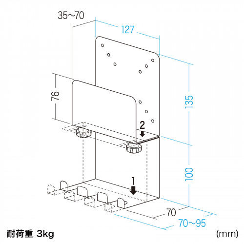 ●メーカー…サンワサプライ●型番…MR-VESA6●カラー…ブラック●サイズ…W127×D70~95×H235mm 挟み込み有効内寸/35~70mm下棚奥行き/70mm●材質…スチール●重量…約510g●出荷形態…ノックダウン組立式●総耐荷重…3kg●付属品…ウレタンパッド(大・2枚)、ウレタンパッド(小・3枚)、ディスプレイ取付けネジ(M4×10・4本)●小型パソコンやハードディスクをディスプレイの背面にセットし、デスクを広く使用できます。●VESA75×75、100×100mmに対応しています。●下段の棚はタップ受けやケーブルマネジメントとして使用できます。●下段の棚が不要な時は取り外しが可能です。また、約25mmスライドするので、スタンドの出っ張りがあっても調整が可能です。●機器のキズ付きを防止するウレタンパッドも付属しています。●対応できるハードディスクのサイズは、幅35~70mmです。●参考在庫数・商品詳細・サイズ情報はメーカー(参考)URLからもご確認いただけます。 ●最小出荷単位: 1