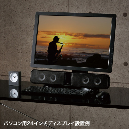 ●メーカー…サンワサプライ●型番…MM-SPSBA2N2●実用最大出力…20W●周波数特性…200~20000Hz●サイズ…500(W)×85(D)×85(H)mm●重量…1396g●インピーダンス…4Ω●スピーカーサイズ…2.5インチ(直径63.5mm)●コネクタ形状…φ3.5mm ステレオミニプラグ●スピーカー形式…バスレフ式フルレンジスピーカーシステム●ケーブル長…3.5mmステレオミニジャック接続ケーブル:1.2mRCAピンジャック接続ケーブル:1.5m電源コード:1.5m●出力端子…サブウーファー出力端子(RCAピンジャック)●入力端子…ステレオミニプラグ(3.5mm)、RCAピンジャック(赤白)●電源内蔵型●ディスプレイ下の空いたスペースにすっきりと設置できる一体型サウンドバースピーカー●実用最大出力5Wのユニットを4個搭載し、合計20Wの迫力サウンドを出力できる一体型サウンドバースピーカーです。●ディスプレイ下の空いたスペースに設置ができ、デスク幅のない環境でもスピーカーを設置することができます。※本製品のディスプレイ下部への設置には高さ90mm程のスペースが必要になります。あらかじめスペースの有無をご確認ください。●24インチのパソコン用ディスプレイや32インチ程度の液晶テレビに最適なサイズとなっており、小さな音量でもはっきりと明確に聞き取ることができるよう、スピーカーユニットをやや上向き加減に設置した設計となっています。●音声入力は3.5mmステレオミニジャックとRCAピンジャック(赤白)入力が可能でテレビやAV機器の音声出力も可能です。映画やニュースなどのセリフやメイン音声がよりはっきりと明瞭に聴こえるようになります。●サブウーファー出力端子を搭載しており、市販されている様々なサブウーハーを接続することができます。映画やゲームなどでより迫力ある重低音を楽しみたい場合にケーブル1本でサブウーファーを増設することができます。●オプションスタンドを付属しているので様々なディスプレイスタンド形状にも対応します。●アンプ内蔵でMP3プレーヤーの出力端子やパソコンの音声出力端子につなぐだけで音楽を楽しめます。 ●<ご注意>※テレビのAV出力ポートに接続した際にテレビの音声、スピーカーの音声両方とも出ている状態ではスピーカーの効果が期待できない場合があります。その際にはテレビ側の音声出力の設定で「外部スピーカーから音声出力をする」もしくは「AVシステムから音声出力をする」などに設定変更しお試しください。詳しくはテレビ側の取扱説明書をご確認ください。●参考在庫数・商品詳細・サイズ情報はメーカー(参考)URLからもご確認いただけます。 ●最小出荷単位: 1