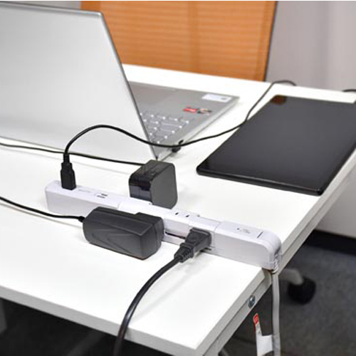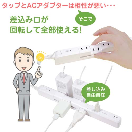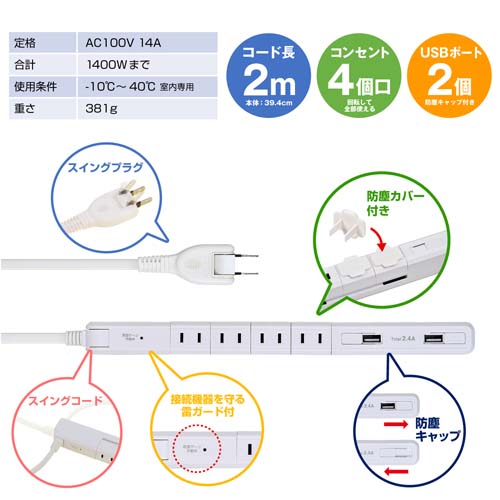 AC100V/14Ax2m回転タップ(4口/USB/雷ガード