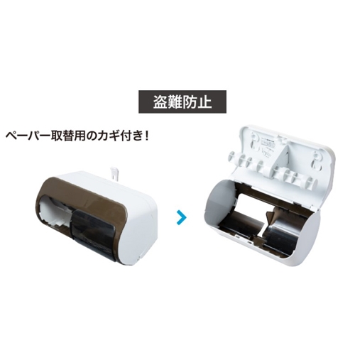 ●メーカー…タカラ産業●型番…2R-TPH●仕様…ビス式●サイズ…265(W)×157(D)×159(H)mm●材質…ABS、POM、SUS●付属品…ブラケット、普通芯軸、鍵、アンカープラグ、タッピンネジ●重量…約800g●鍵付きのホルダーでトイレットペーパーの盗難防止に!●前面から取り出せないよう窓付きでペーパーをしっかりホールド!●普通芯と細芯に対応した、やさしいフォルムのトイレットペーパーホルダーです。●直径120mm以下、幅105~114mm、軸穴径30~38mmのペーパーを使用してください。●ホルダーには2つのペーパーを補充できます。●ホルダーの開閉は専用のカギを使って行います。 カギがないと開かないため盗難防止になります。●参考在庫数・商品詳細・サイズ情報はメーカー(参考)URLからもご確認いただけます。 ●最小出荷単位: 1